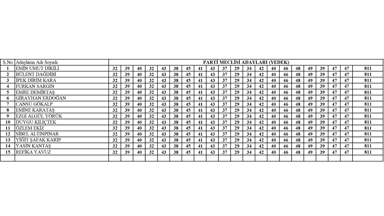 PM için 1327 delegenin 875’i oy kullandı, 63 oy geçersiz sayıldı. Listede birinci sırayı 799 oy alan Erhan Adem aldı. Onu Zeliha Aksaz Şahbaz, Nurhayat Altaca Kayışoğlu, Baki Aydöner takip etti.